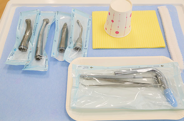 使用している器財や道具はすべて使い捨てか滅菌済みの物で、器具は滅菌パックしてあります。歯を削る道具のハンドピースは、専用の洗浄機械と滅菌器を使い、滅菌の難しい内部まで滅菌するなど、すべてに最新の徹底した衛生管理をしております。また、レントゲン撮影ではデジタルレントゲンを使用し、X線被爆量を従来の約1/10まで減少させております。