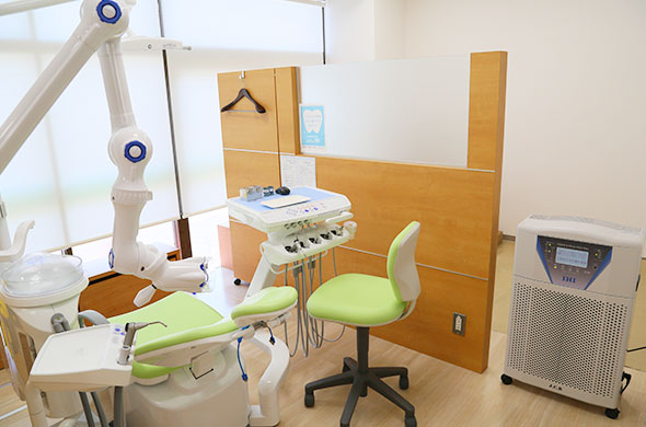 歯を削ったりしたときには、お口のなかの汚れが空気中に飛散します。当院では、これを各ユニットに取り付けてある口腔外バキュームで吸引することにより、院内の汚染を防止しています。